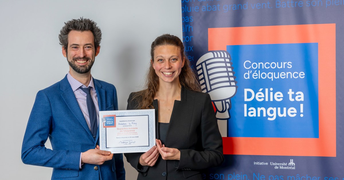 Organisé par l’Université de Montréal, le concours Délie ta langue! vise à promouvoir l’usage de la langue française de façon positive, originale et dynamique. L’initiative permet de développer des compétences oratoires et de maitriser la prise de parole en public. Le concours était ouvert aux étudiantes et étudiants de premier cycle de 15 universités du Québec, de l’Ontario, de l’Alberta et du Nouveau-Brunswick.