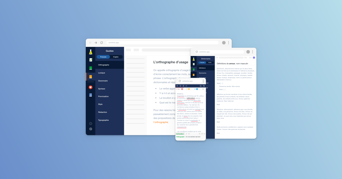Antidote Web reproduit fidèlement l’interface bien connue d’Antidote 10, mais à travers la fenêtre d’un navigateur. Les multiples fonctions de son correcteur, notamment, ont été soigneusement adaptées aussi bien aux écrans des Chromebook qu’à l’espace limité des écrans de téléphone. Pour la première fois, le correcteur d’Antidote peut être utilisé efficacement à partir de la plupart des téléphones de type Android ou iPhone.
