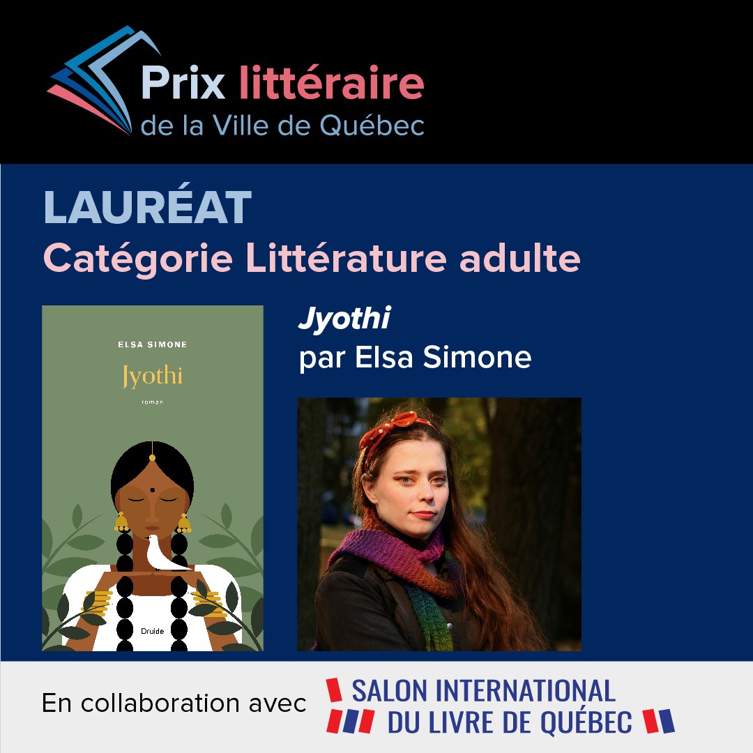 Les Éditions Druide félicitent l’autrice Elsa Simone, lauréate du prix littéraire de la Ville de Québec 2024, catégorie Littérature adulte, pour son roman Jyothi. Ce prix, qui s’accompagne d’une bourse de 5 000 $, est attribué par la Ville et le Salon international du livre de Québec. Il récompense le talent d’auteurs et d’autrices des six arrondissements de la ville de Québec et de Wendake.
