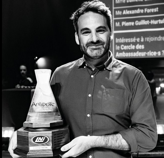À l’occasion de la soirée-bénéfice intitulée Le Choc des Titans, tenue hier soir au Club Soda, Mathieu Lepage a reçu la coupe Antidote pour ses performances de la saison 2022. Cette distinction parrainée par Druide informatique souligne l’usage méritoire du français dans le cadre des matchs enlevants qu’organise le Théâtre de la Ligue Nationale d’Improvisation (LNI).