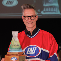 François-Étienne Paré a reçu la coupe Antidote 2024 pour son usage méritoire du français pendant les matchs d’improvisation du Théâtre de la LNI.